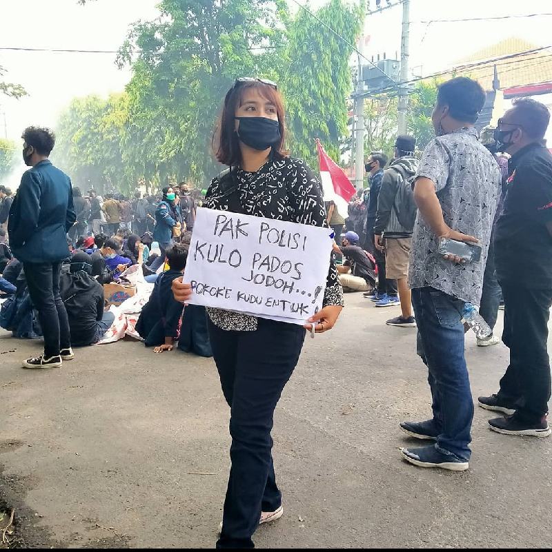 Di unggah dari akun Instagram @shandida_sastra dengan hastag #demokediri ia membawa sebuah kertas bertuliskan ” PAK POLISI KULO PADOS JODOH…! POKOK’E KUDU ENTUK !”. Jika di terjemahkan kedalam bahasa Indonesia tulisan tersebut artinya ” Pak polisi saya cari jodoh, Pokok harus dapat !” .