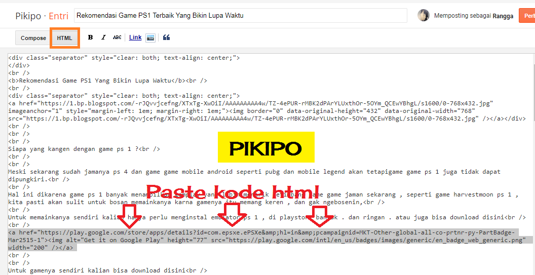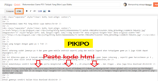 5. Terakhir paste kan code HTML yang sudah di dapat tadi di artikel