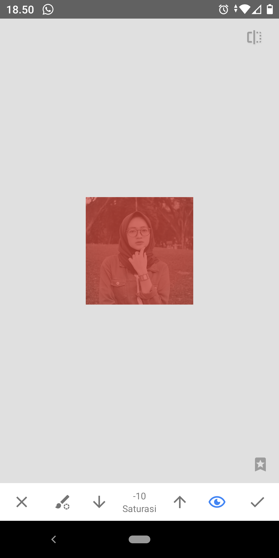 4. Di langkah ke empat kalian naikan tingkat saturasinya menjadi Penghapus Saturasi. Pada langkah ini kalian hapus pada bagian foto kalian secara hati – hati agar hasil yang didapatkan rapi. Kalian bisa menyalakan tombol mata di pojok kanan bawah untuk melihat bagian mana yang belum dihapus.