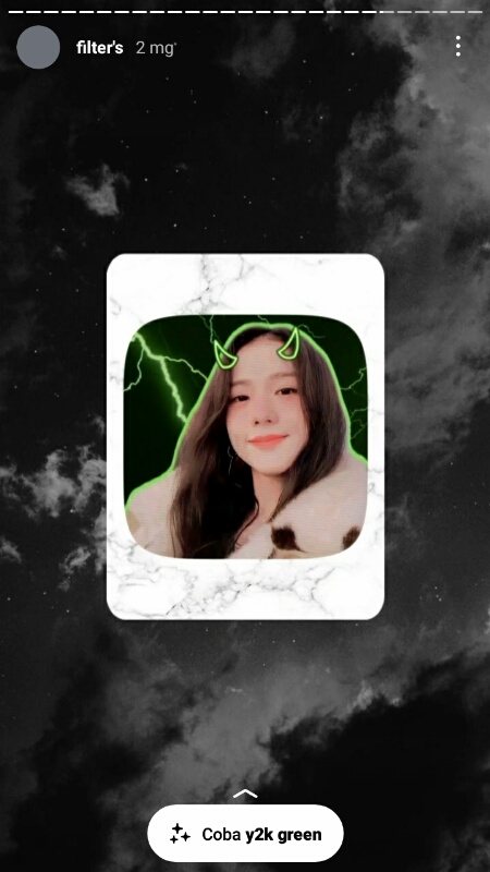 Filter ini sangat menarik karena menampilkan hasil layar kamera yang berwarna hijau dan hitam. Tak hanya itu ada juga tambahan background petir yang berwarna hijau membuat tampilan tambah keren dan aesthetic.