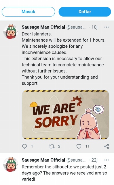 Rencananya pengembang game Sausage Man akan melakukan maintenance pada pukul (08.00-09) pagi atau jam (07.00-08.00) WIB. Tapi waktu tersebut hanya perkiraan saja untuk kurang atau lebihnya waktu yang di tentukan masih tergantung pada keberhasilan maintenance tersebut.
