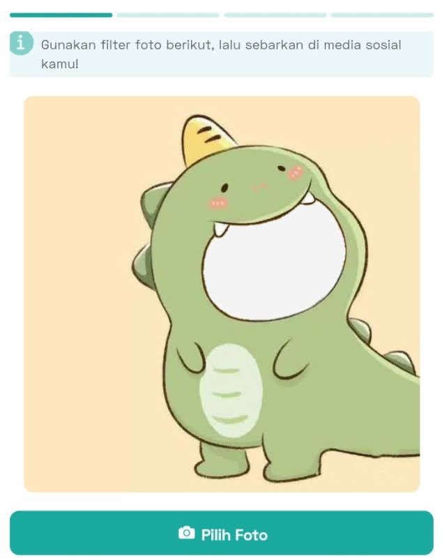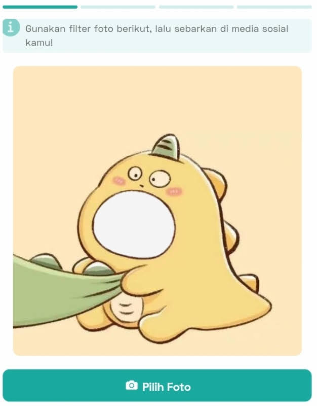 - Jika sudah, selanjutnya tinggal kalian klik Pilih Foto dan masukan foto wajah kalian pada bingkai dino hijau atau bingkai dino kuning.